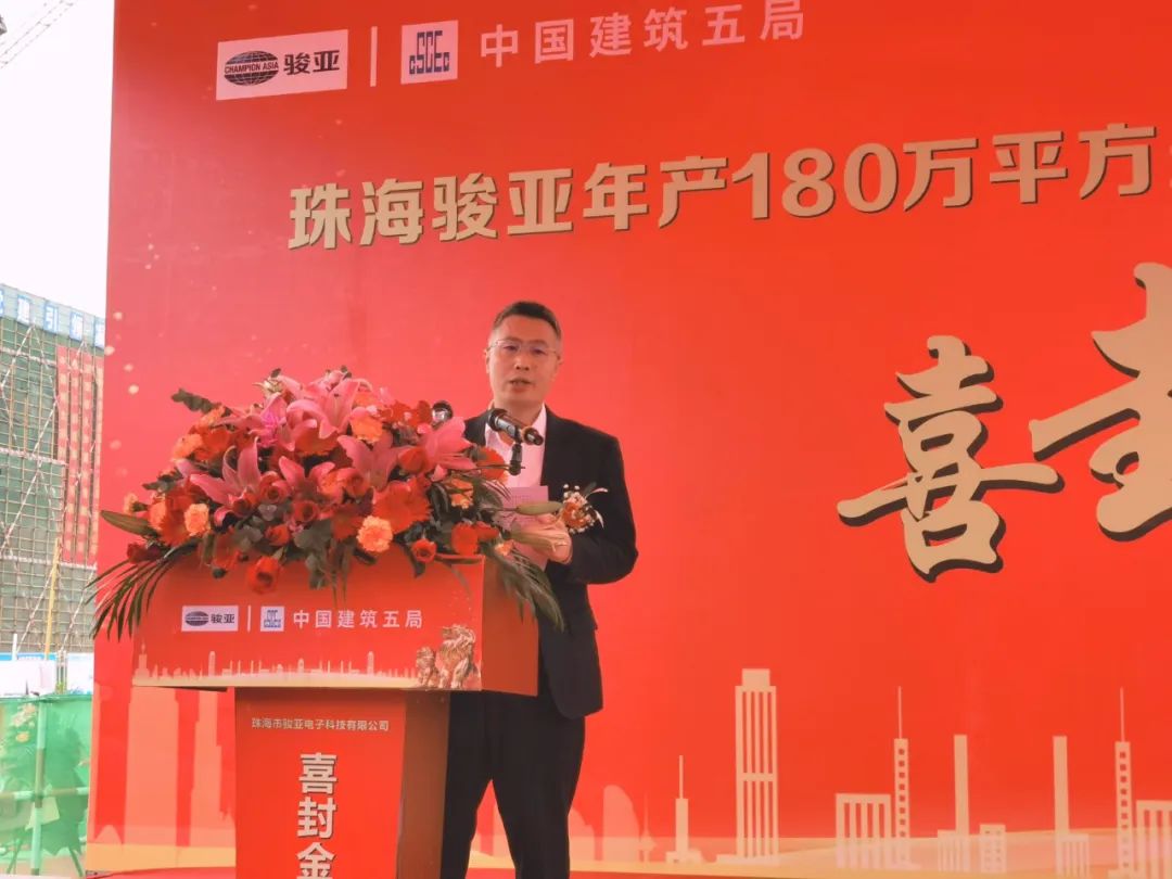 广东骏亚董事长、总经理叶晓彬先生表示:珠海骏亚项目是广东骏亚的重点建设项目,一期封顶标志着广东骏亚在珠海生产基地的建设取得阶段性重要成果,希望全体参建人员再接再厉,进一步把好质量关,加强安全管理和质量管理、加快施工进度,确保珠海骏亚项目整体工程早日投产,早日为推进珠海的经济和社会发展贡献一份力量。