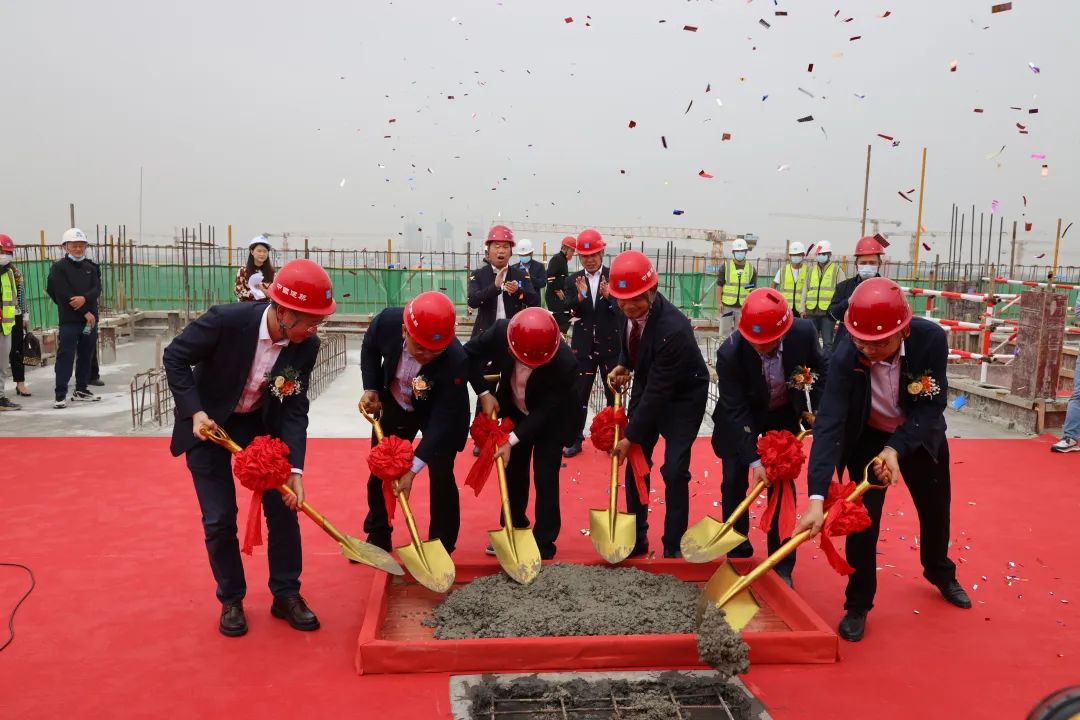 在一片欢快的锣鼓声中,各位领导及嘉宾步行前往封顶地点,进入喜封金口环节,伴随着封顶现场鼓乐齐鸣、礼花齐放,各位领导挥动手中的金锹,共同协作浇筑最后一方混凝土,封顶仪式达到了高潮。